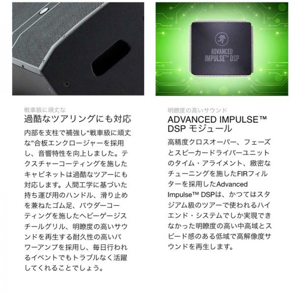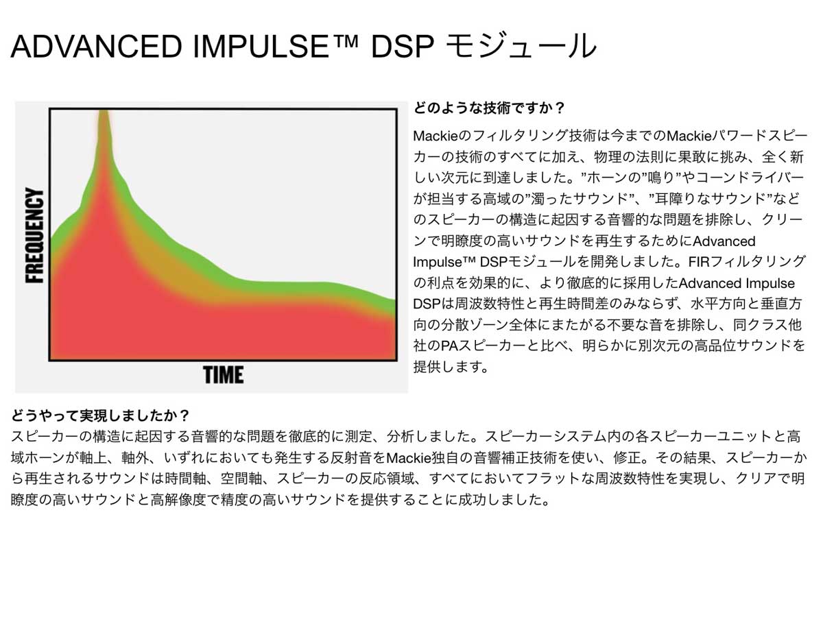 DRMシリーズパワードラウドスピーカーはパワーファクターコレクションテクノロジーを搭載し、様々な現場で最適なピーク出力を確保します。またスピーカー破損を事前に回避する次世代保護回路も搭載。大切な機材を的確に保護してくれます。クラス上位の超高効率D級パワーアンプを搭載し明瞭度の高いハイパワーサウンドを実現します。さらに高精度クロスオーバー、フェーズとスピーカードライバーユニットのタイム・アライメント、緻密なチューニングを施したFIRフィルターを採用したAdvanced Impulse DSPを搭載し、かつてはスタジアム級のツアーで使われるハイエンド・システムでしか実現できなかった明瞭度の高い中高域とスピード感のある低域で高解像度サウンドを再生します。