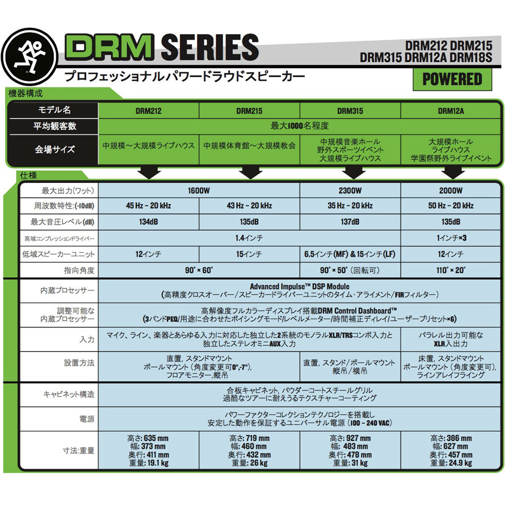MACKIE マッキー DRM18S (1本) ◆ パワードサブウーファー 18インチ 最大 2000W , 135dB   アンプ搭載タイプ 【代金引換不可】 MACKIE マッキー DRM212&DRM212-P Cover  (1個) ◆ DRM212&DRM212-P用カバー MACKIE マッキー DRM12A (1本) ◆ パワードラインアレイスピーカー 12インチ 2-Way 最大 2000W , 135dB アンプ搭載タイプ 【代金引換不可】 MACKIE マッキー DRM315 (1本) ◆ パワードスピーカー 15インチ 3-Way 最大 2300W , 137dB   アンプ搭載タイプ 【代金引換不可】