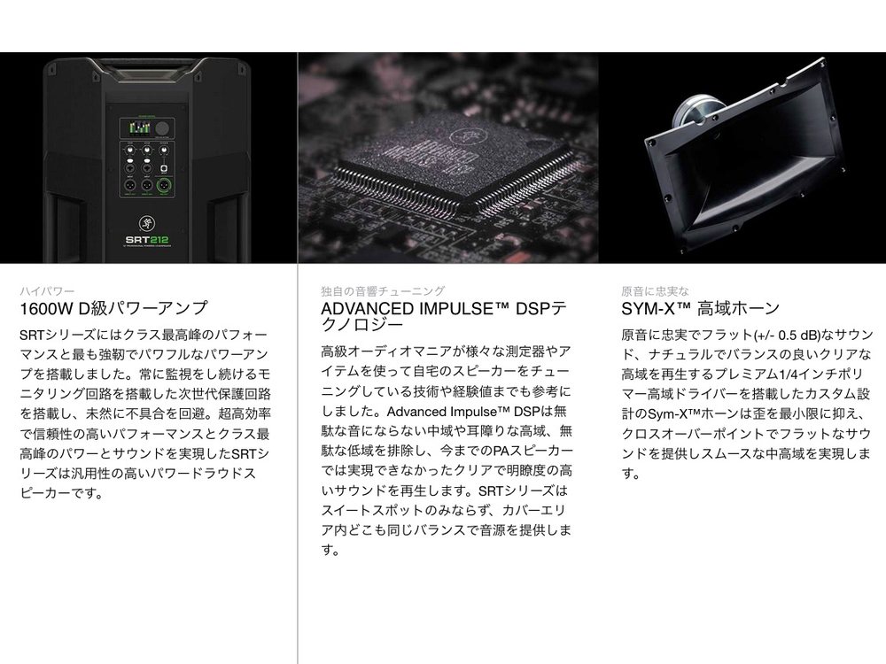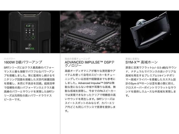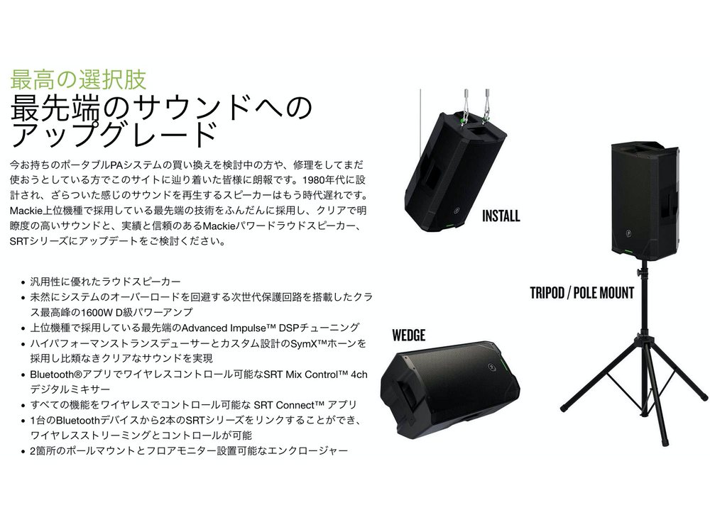 Mackie SRTシリーズは上位機種の技術をふんだんに採用しながらコストパフォーマンスに優れたプロフェショナルパワードラウドスピーカーです。最新の音響処理技術と、ハイパワー1600Wパワーアンプを採用。さらにSRT Mix ControlとSRT Connect アプリから誰でも簡単に素早く最適なスピーカーのセットアップを行うことができます。