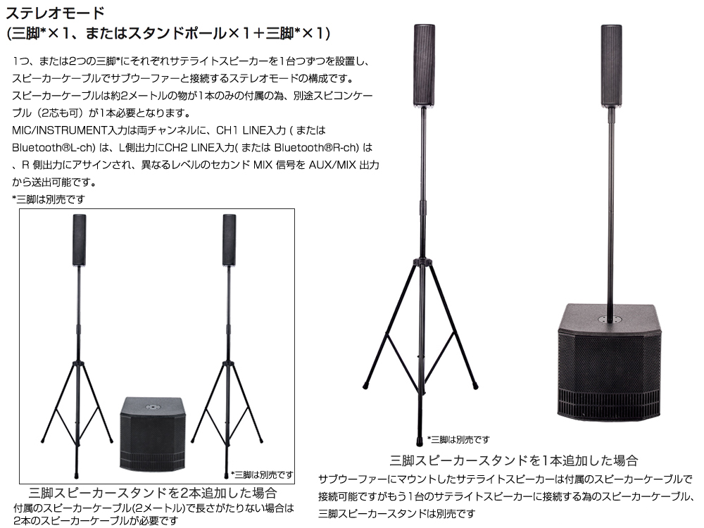 ※ステレオモードには別売りの専用スタンド、スピーカーケーブルが必要です