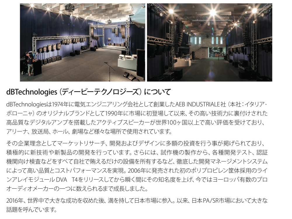 dBTechnologies は1974年に電気エンジニアリング会社として創業したAEB INDUSTRIALE社(本社:イタリア・ボローニャ)のオリジナルブランドとして1990年に市場に初登場して以来、その高い技術力に裏付けされた高 品質なデジタルアンプを搭載したアクティブスピーカーが世界100ヶ国以上で高い評価を受けており、ユベントススタジアム、ドルトムントスタジアム、ミラノ空港、ドバイ空港などをはじめ世界中のスタジアム、アリーナ、放送局、ホール、劇場など様々な場所で使用されています。