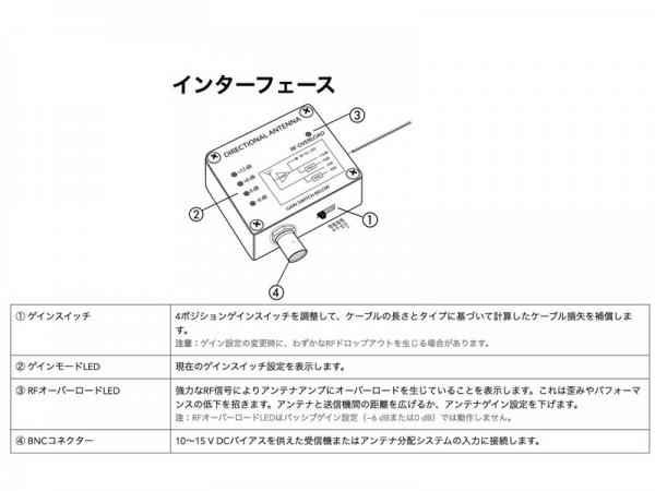 ・アンテナケーブルによる損失を補償するためのアンプを内蔵。+12dB/+6dB/0dB/-6dBのゲインが設定可能。