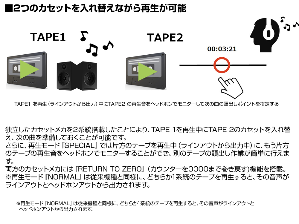 ・片方のテープを再生中に、もう片方のテープの音声をヘッドホンモニターすることで、次の曲の頭出し準備が可能な再生モード『SPECIAL』を搭載