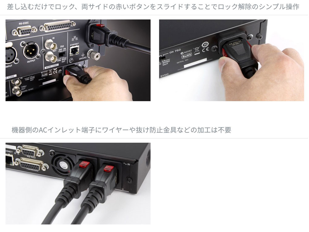 機器側のACインレット端子にワイヤーや抜け防止金具などの加工は不要