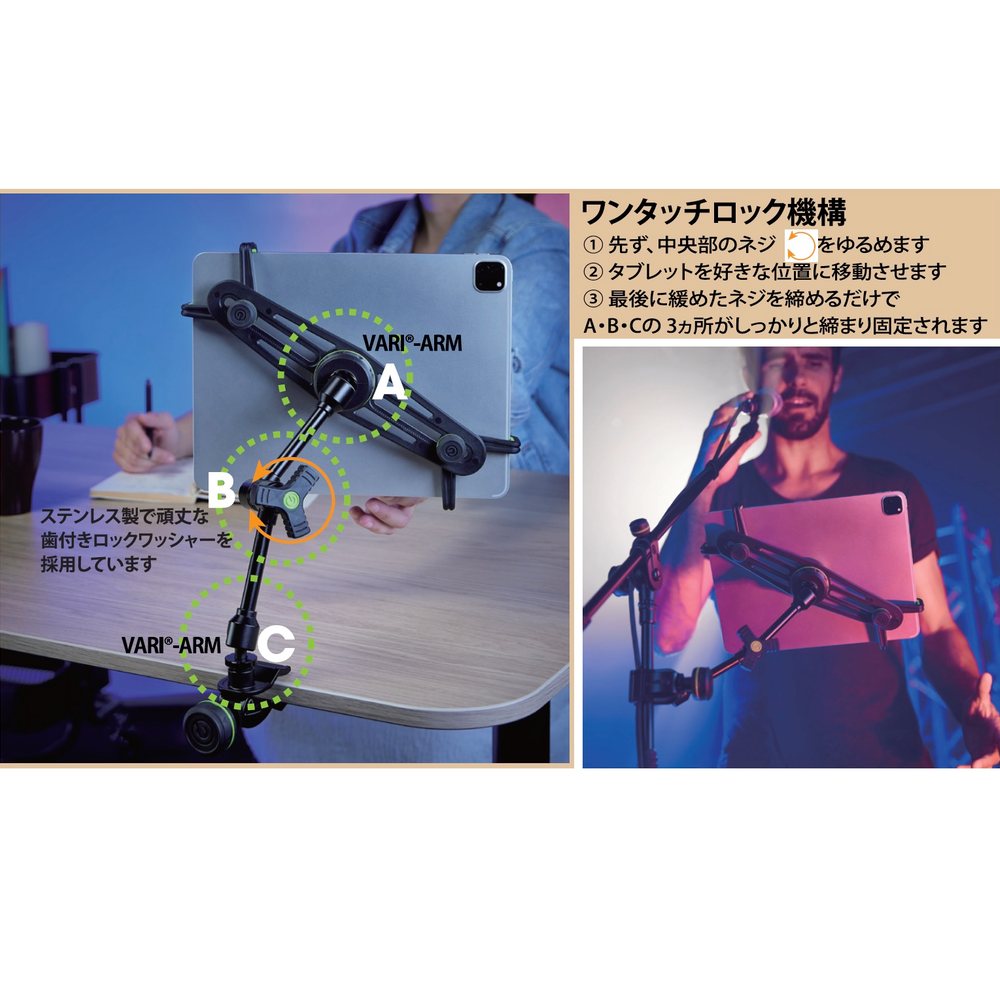 中央にあるセントラルロックは、1本のセットスクリューで全てのジョイントを簡単に硬くロックします。細かな調整を行いながら、ライブ中や収録中でも簡単にベストポジションに調節可能です。更にステンレス製の歯付きロックワッシャーを採用しており、長期間の使用でも錆びることなく優れた耐久性を兼ね備えています。ミュージシャンやDJ、エンターテイナー、プロデューサー、ポッドキャスター等、特にタブレットで音楽制作やパフォーマンスをしている方に便利なアイテムです。