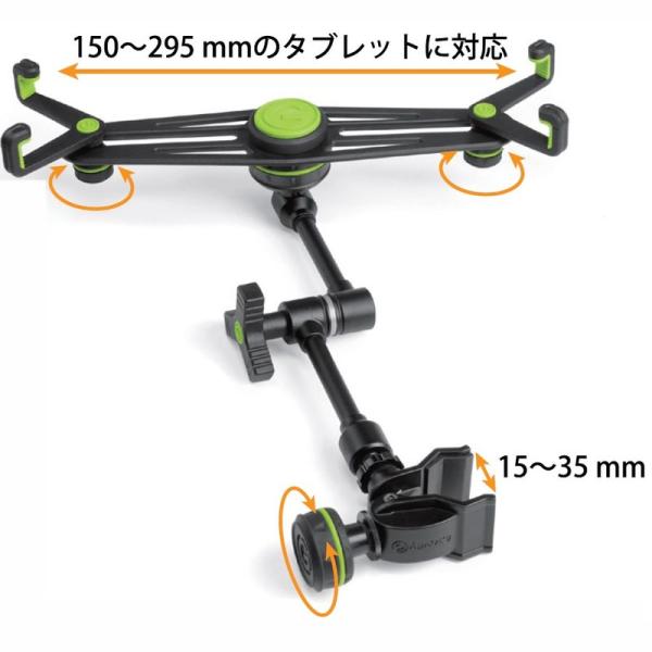 GMATH01Bはタブレットをあらゆるシーンでも手軽に使用できるクランプ式のタブレットホルダーです。調整可能なホルダー部分は最小15mmから最大35mmのタブレットに対応しており、クランプ部分は最小15mmから最大35mmの幅広いクランプレンジを持ちます。ステージ上のマイクスタンドやテーブルになどにも対応できる革新的なタブレットホルダーで作業環境快適にします。