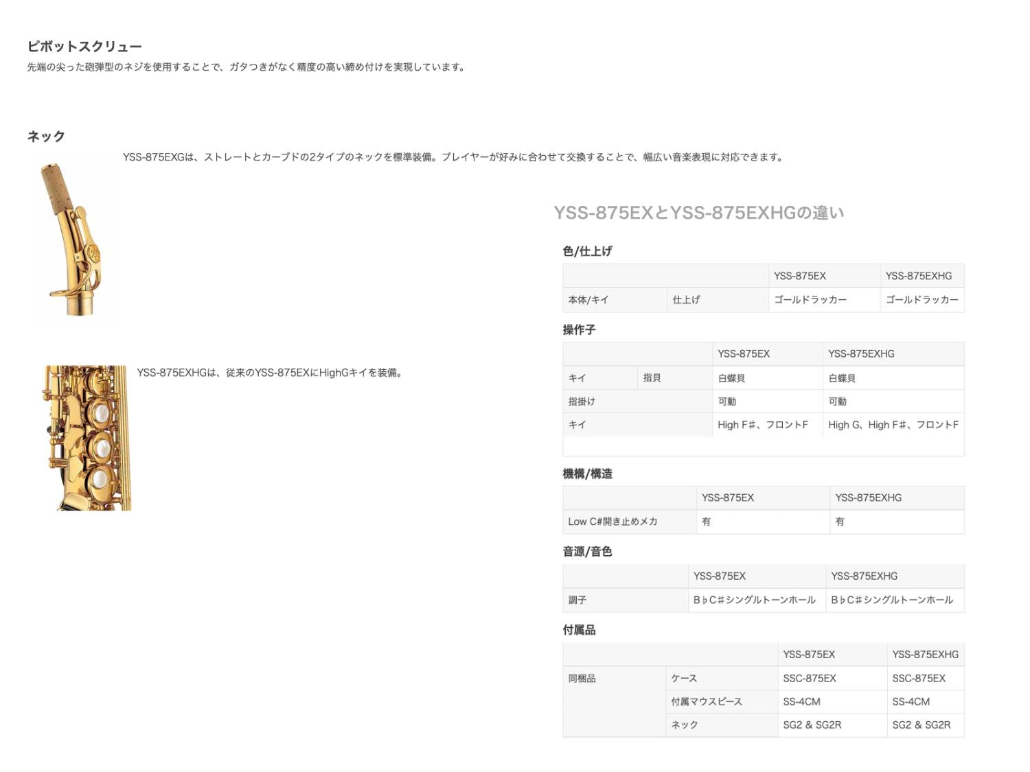 ・YSS-875EXHGS...イエローブラス製、銀メッキ仕上げ、ネックデタッチャブル式(G2ネック ストレート、カーブド)、HighGキイ付き
