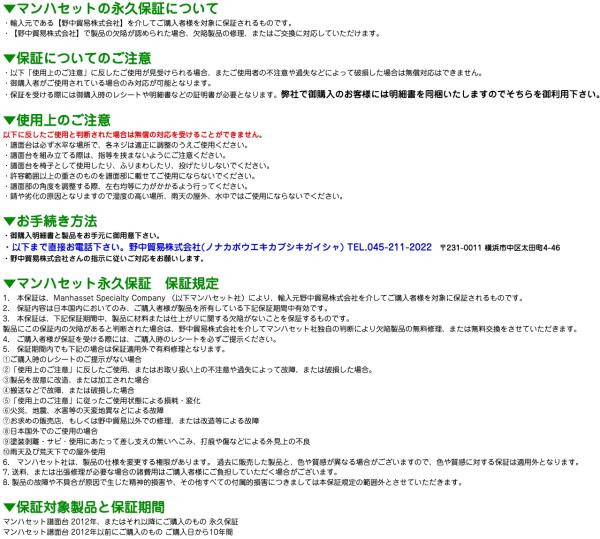▼永久保証について 弊社で御購入のお客様には明細書を同梱いたします。直接 野中貿易株式会社(ノナカボウエキカブシキガイシャ) TEL.045-211-2022 までお問い合わせ下さい。 「使用上のご注意」に反したご使用が見受けられる場合、またご使用者の不注意や過失などによって破損した場合は無償対応はできません。