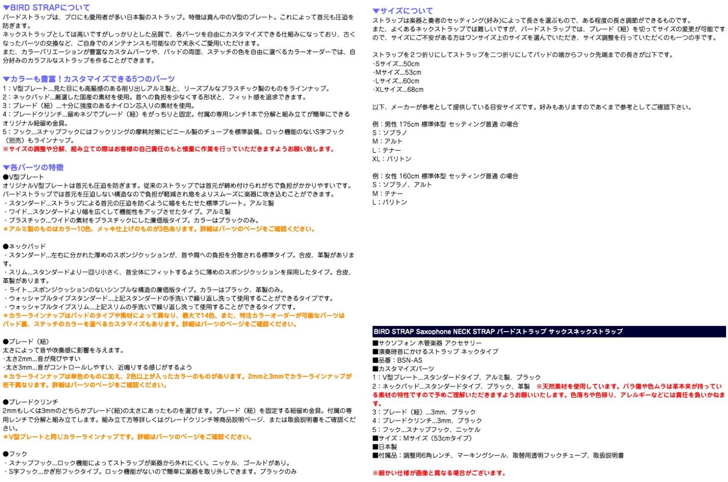 ▼サイズについて ストラップは楽器と奏者のセッティング(好み)によって長さを選ぶもので、ある程度の長さ調節ができるものです。 また、よくあるネックストラップでは難しいですが、バードストラップでは、ブレード(紐)を切ってサイズの変更が可能ですので、サイズにご不安がある方はワンサイズ上のサイズを選んでいただき、サイズ調整を行っていただくのも一つの手です。