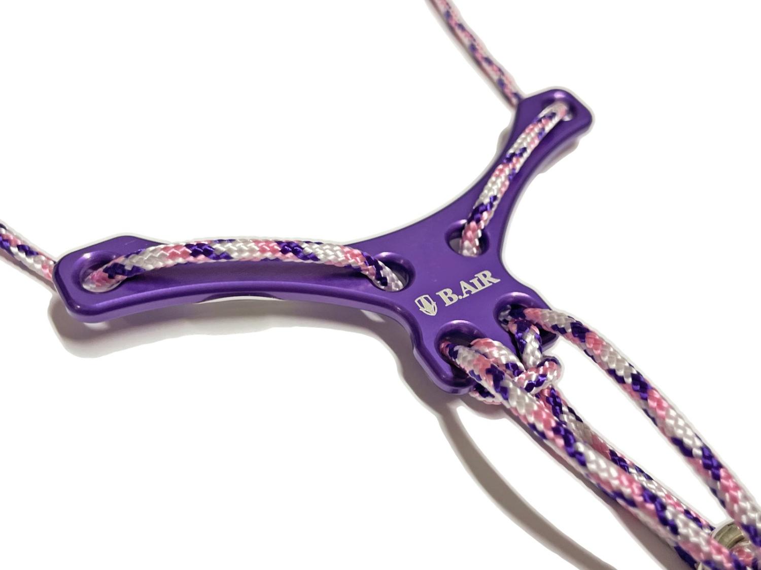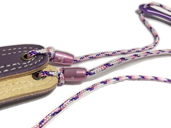 メーカーカタログ品番BSN-ASのV型プレートとブレードクリンチをブラックからパープルに、またブレード(紐)を変更、パッドをカラーパッドのバイオレット(パープル)へカスタムパーツを組み合わせて作成したオリジナルの組み合わせストラップ