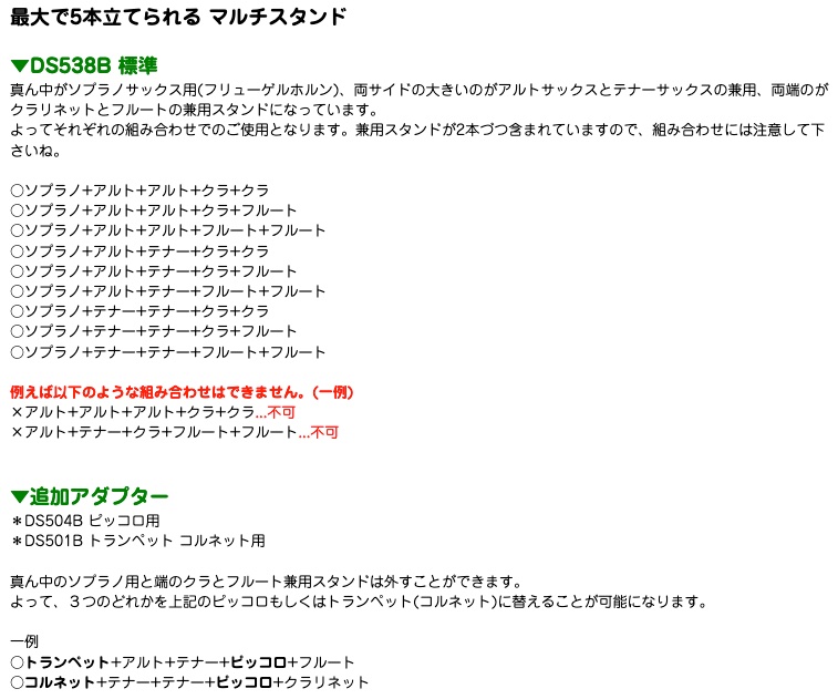 こちらはスタンドアダプターの追加はできません。ただ、もとのソプラノ、フルート兼クラリネットのスタンド部分3個は取り外すことができます。ですので、以下のアダプターへ交換が可能です。