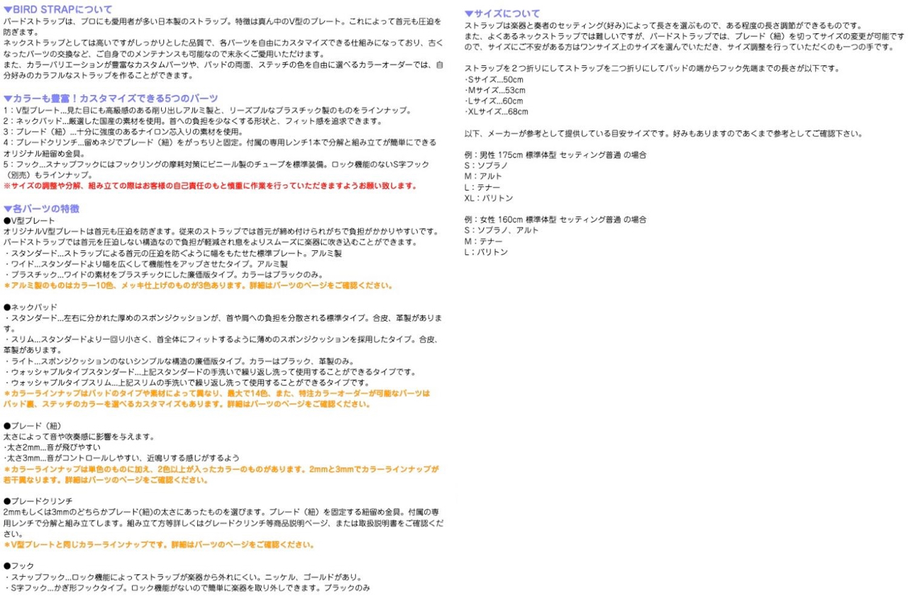 ▼サイズについて ストラップは楽器と奏者のセッティング(好み)によって長さを選ぶもので、ある程度の長さ調節ができるものです。 また、よくあるネックストラップでは難しいですが、バードストラップでは、ブレード(紐)を切ってサイズの変更が可能ですので、サイズにご不安がある方はワンサイズ上のサイズを選んでいただき、サイズ調整を行っていただくのも一つの手です。