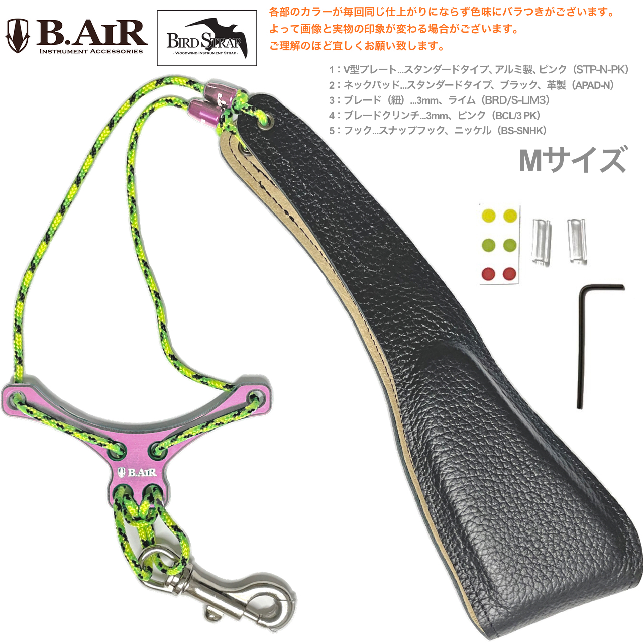 B.AIR ビーエアー バードストラップ カスタマイズ ピンク ライムグリーン サックス用 Mサイズ 3mm ネックストラップ BIRD STRAP standard saxophone 北海道 沖縄 離島不可スタンダード アルミ製プレート スナップフック 革製 Alto Tenor sax