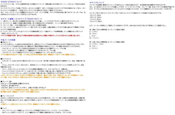 ▼サイズについて ストラップは楽器と奏者のセッティング(好み)によって長さを選ぶもので、ある程度の長さ調節ができるものです。 また、よくあるネックストラップでは難しいですが、バードストラップでは、ブレード(紐)を切ってサイズの変更が可能ですので、サイズにご不安がある方はワンサイズ上のサイズを選んでいただき、サイズ調整を行っていただくのも一つの手です。