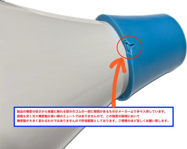 製品の精度の低さから楽器に触れる部分のゴムの一部に隙間があるものがメーカーより多々入荷しています。価格も安く元々機密製が高い類のミュートではありませんので、この程度の隙間において機密製が大きく変わるわけではありませんので許容範囲としております。ご理解のほど宜しくお願い致します。