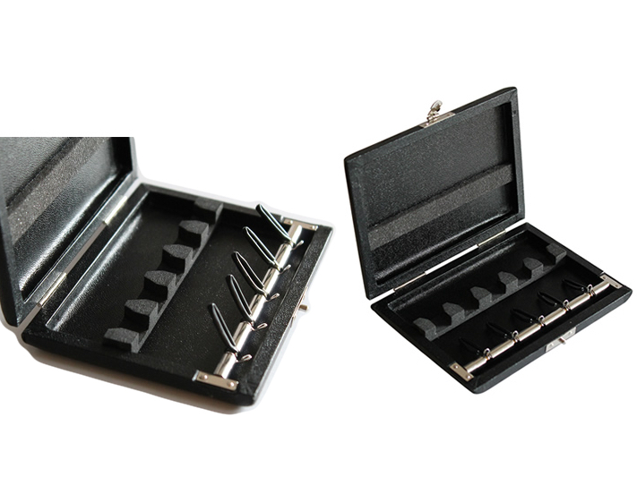 ・留め具差し込み式...リードを1本ずつ差し込むバネはリードケースの中でリードを動きにくくしてくれ、蓋を開けた際に勢いで落とすのを防いでもくれます。リードを取り出すときもバネごと起こしてあげればいいのでリードの端面を引っ掛けてしまうことも少ないかと思います。