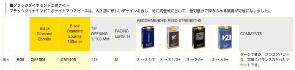 ブラックダイヤモンドエボナイトマウスピースは、内外部に新しいデザインを施し、特に高音域において、色彩豊かで深みのある演奏が可能になりました。440Hzのモデルもあります。(CM1405 13Series)
