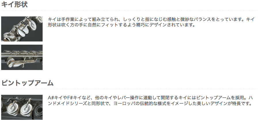 ・キイ形状...キイは手作業によって組み立てられ、しっくりと指になじむ感触と微妙なバランスをとっています。キイ形状は吹く方の手に自然にフィットするよう精巧にデザインされています。