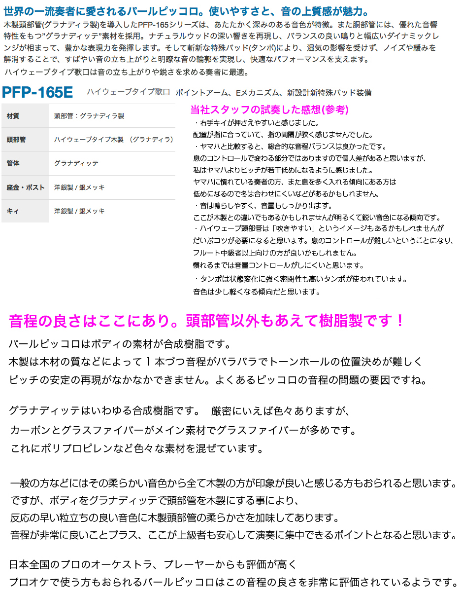 PEARL FLUTE Piccolo PFP-165E パールフルート 木製 ピッコロ PFP165E木製頭部管はあたたかく深みのある音色が特徴。また胴部管には、優れた音響特性をもつグラナディッテ素材。ナチュラルウッドの深い響きを再現し、バランスの良い鳴りと幅広いダイナミックレンジが相まって、豊かな表現力を発揮します。そして斬新な特殊タンポにより、湿気の影響を受けず、ノイズや緩みを解消しすばやい音の立ち上がりと明瞭な音の輪郭を実現。