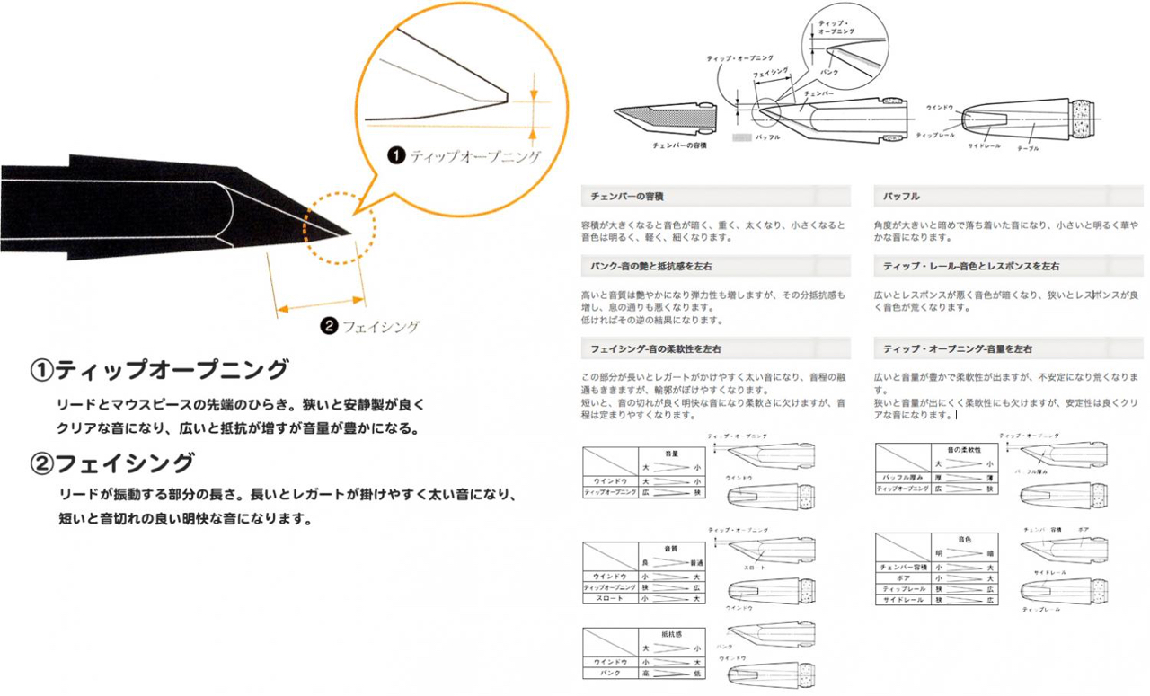 ・先端(ティップ):欠けたり、傷が付いていたりしませんか?こすれたり、ちょっとの欠けがあったらリードが十分に振動しません。