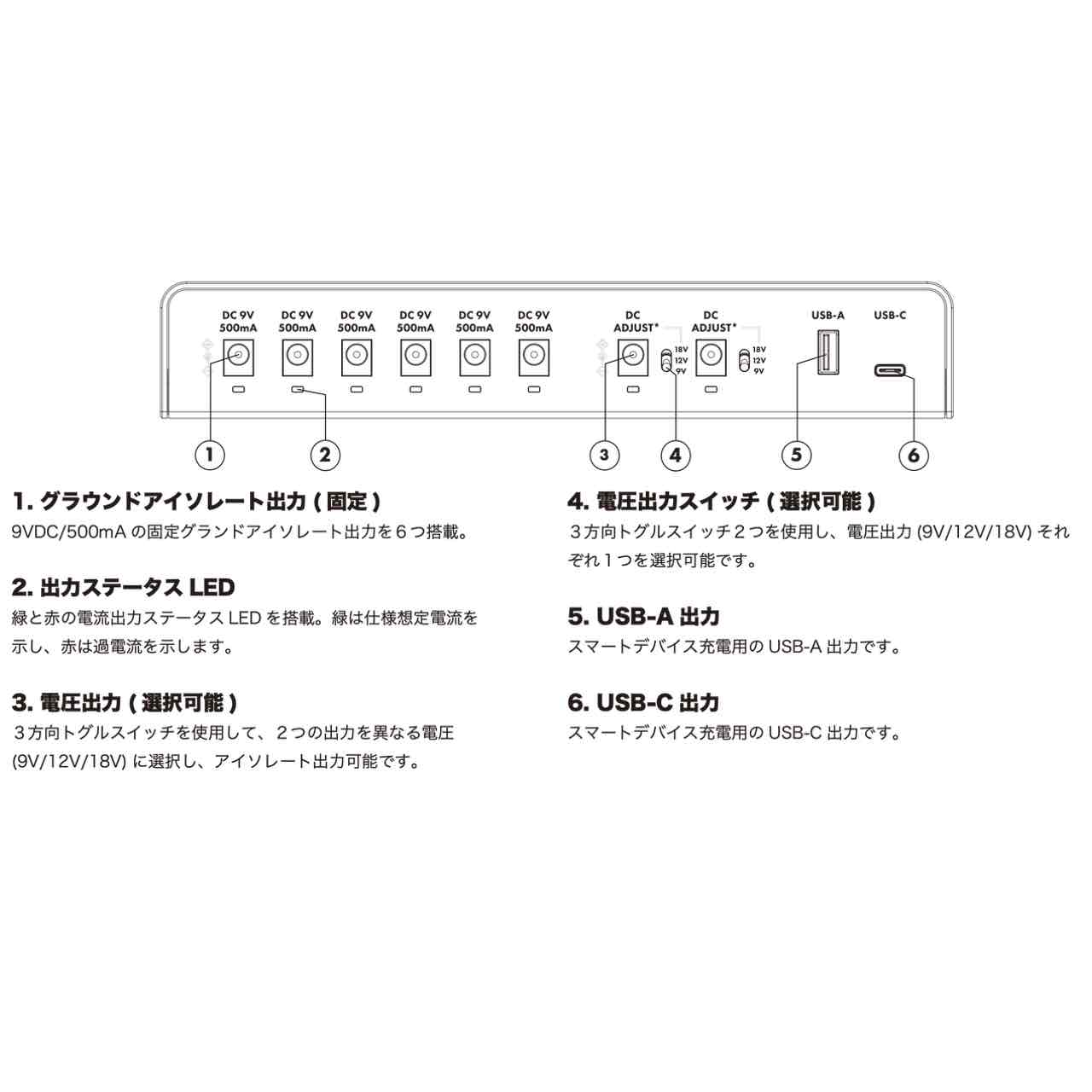 本機は、高品質な電力、 最高のパフォーマンスと利便性の実現のため、スタイリッ シュにデザインされたパワーサプライです。 8つのグランドアイソレート出力 (2つは電圧選択可能 )、スマートデバイス用 USB-A / USB-C 出力を搭載し、 エフェクトチェーンを活性化させます。あなたのエフェクターをプロフェッショナルかつ効率的に整理できる頼もしいギアとなっております。