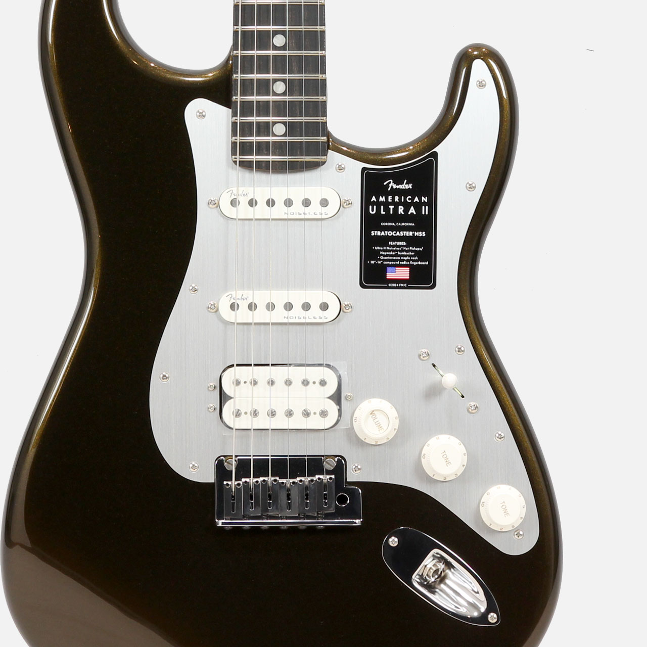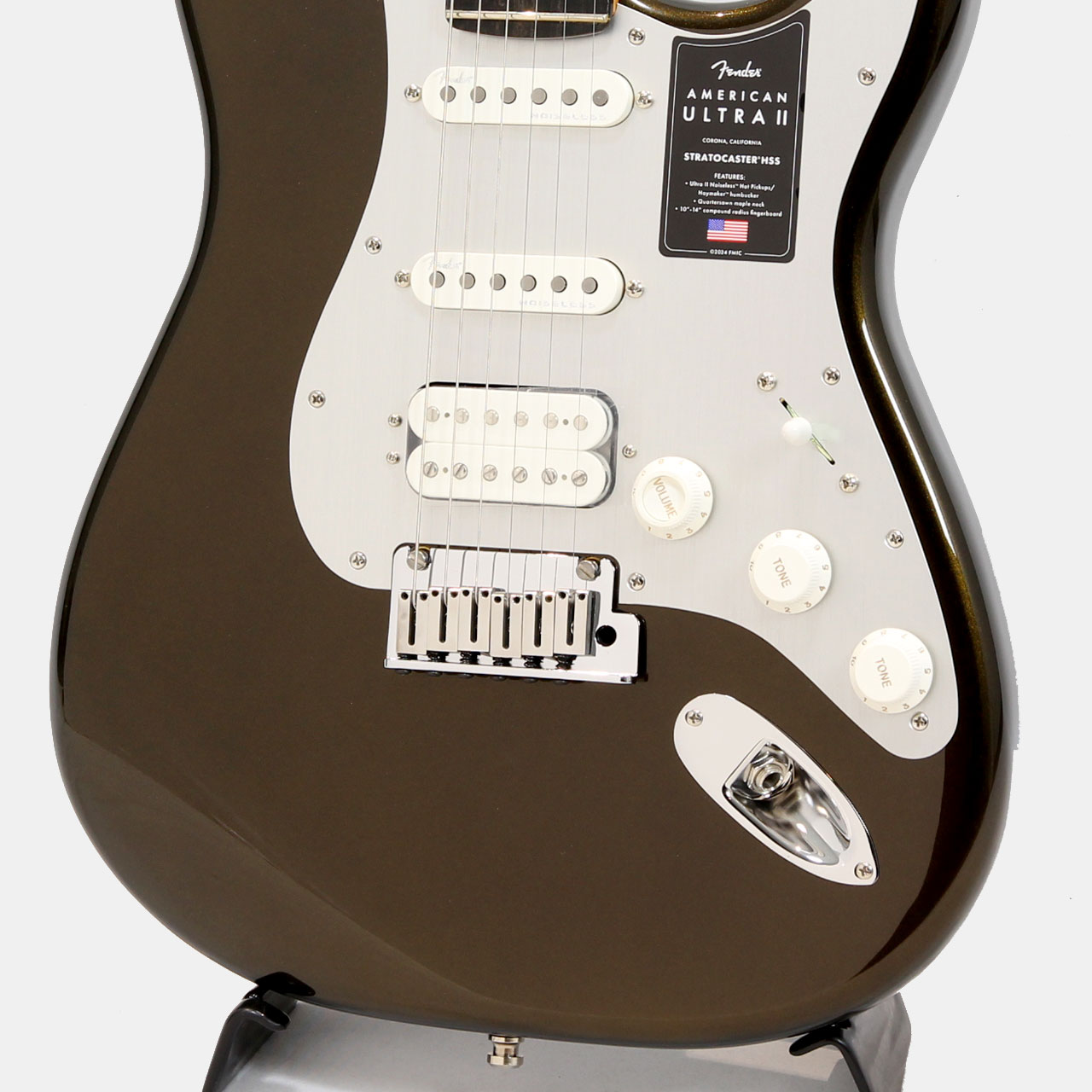 ポップインアーム付き2点支持American Ultraシンクロナイズドトレモロ、ポリッシュ仕上げのステンレスブロックサドル、コールドロールドスチールブロック、デラックスロッキングチューニングマシン、ソフトタッチノブ、1-plyアノダイズドピックガードなど、高い実用性を誇る機能を搭載しています。