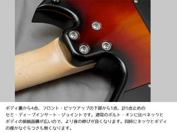 ネックジョイントはセミ・ディープインサート・ジョイントです。ボディ裏から4点、フロント・ピックアップの下部から1点、計5点止めです。通常のボルト・オンに比べネックとボディの接続面積が広いので、より音の伸びが良くなります。同時にネックとボディの僅かなぐらつきも無くなります。