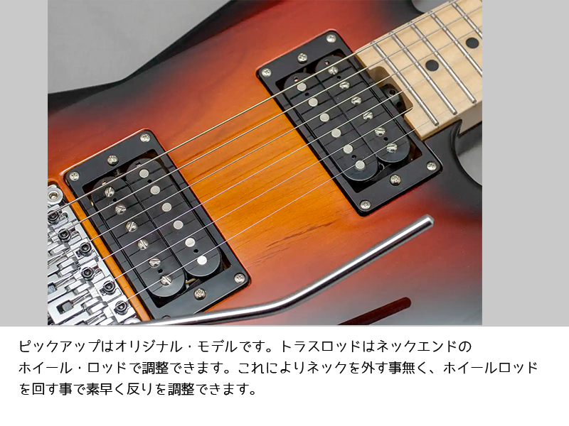 Wheel Truss Rod:ホイールトラスロッドトラスロッドはネックエンドのホイールロッドで調整できます。これによりネックを外す事無く、ホイールロッドを回す事で素早く反りを調整できます。