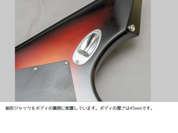 ネックジョイントはセミ・ディープインサート・ジョイントです。ボディ裏から4点、フロント・ピックアップの下部から1点、計5点止めです。通常のボルト・オンに比べネックとボディの接続面積が広いので、より音の伸びが良くなります。同時にネックとボディの僅かなぐらつきも無くなります。