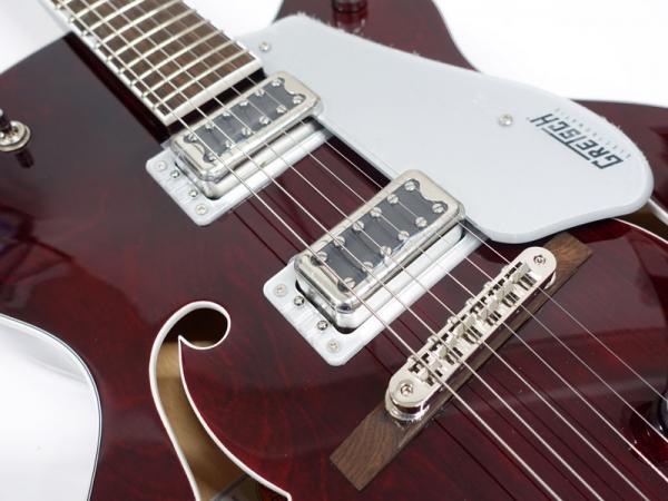 G5420T Electromatic Classic Hollow Body Single-Cut with Bigsbyは、ヴィンテージにインスパイアされた洗練されたアーチを備えたラミネートメイプルボディと、不要なフィードバックノイズを軽減する全く新しいトレッスルブロックブレース設計を採用しています。ボディトップとバックの間に強度の高い接着を施した、新しいトレッスルブロック設計は、より的確でスナップの効いたトーン、より伸びやかでスピーディなレスポンスで攻撃力の高いサウンドをもたらします。全く新しいFT-5E FilterʼTronピックアップと相まって、このホロウボディサウンドは強力なフルボディパンチを放ち、クラシカルな煌びやかさと増強された存在感、明瞭で正確なプレイを加速させます。