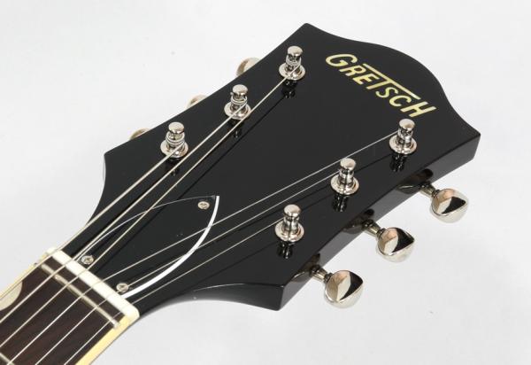 ピュアなトーンと快適な演奏性のために設計されたこのギターはニッケルメッキ加工のGアロー・コントロールノブ、黒い縁飾り付きのエイジド・ホワイトバインディング、耐久性のあるグロスウレタン・フィニッシュ、エイジドパーロイド・サムネイルインレイを採用。グレッチロゴ入り、厚いヴィンテージ・スタイルのシルバー・プレキシピックガード、ニッケルメッキ加工のGrover Sta-Titeチューナーなど、グレッチファンが望む、伝統的な仕様の約束ごとを備えています。