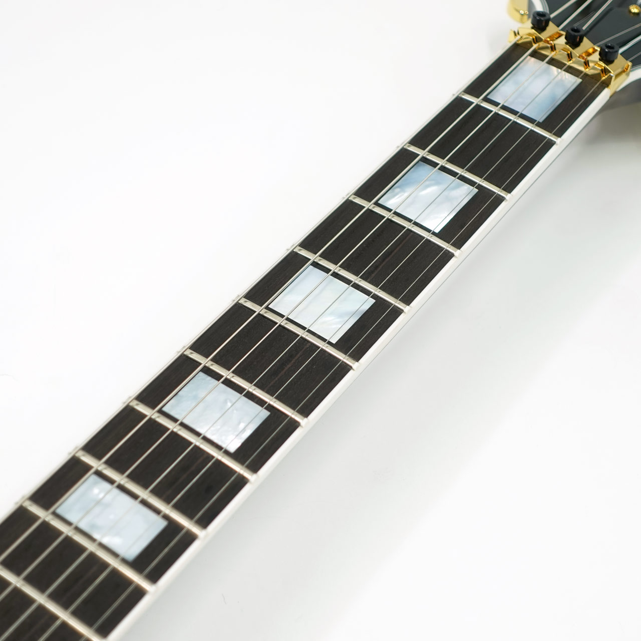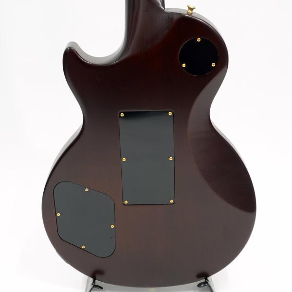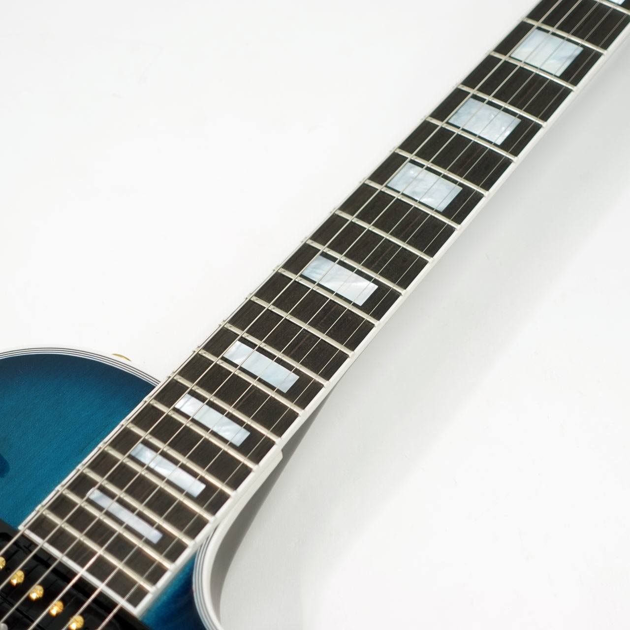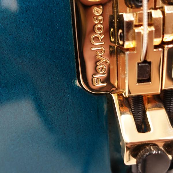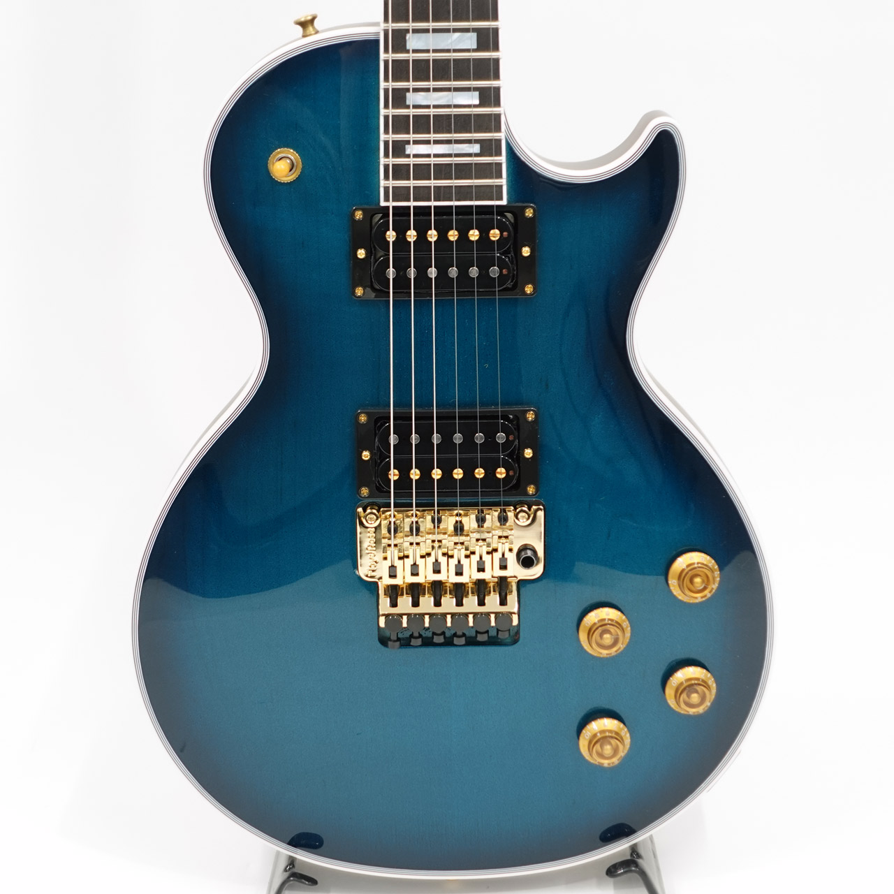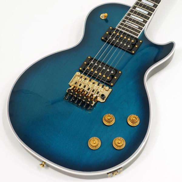 本機は国内入荷の少ないフロイドローズを搭載したモダンスタイルレスポールの極致、Les Paul Axcessを基にアレンジメントを施した一本。カラーリングにはMod Collectionのエクスクルーシブカラーとなる「Fathom Blue Perimeter」を採用。水中をイメージしたメタリックの粒子を含ませたブルーにうっすらトップのメイプルの杢目が透けた味わいのあるフィニッシュ。