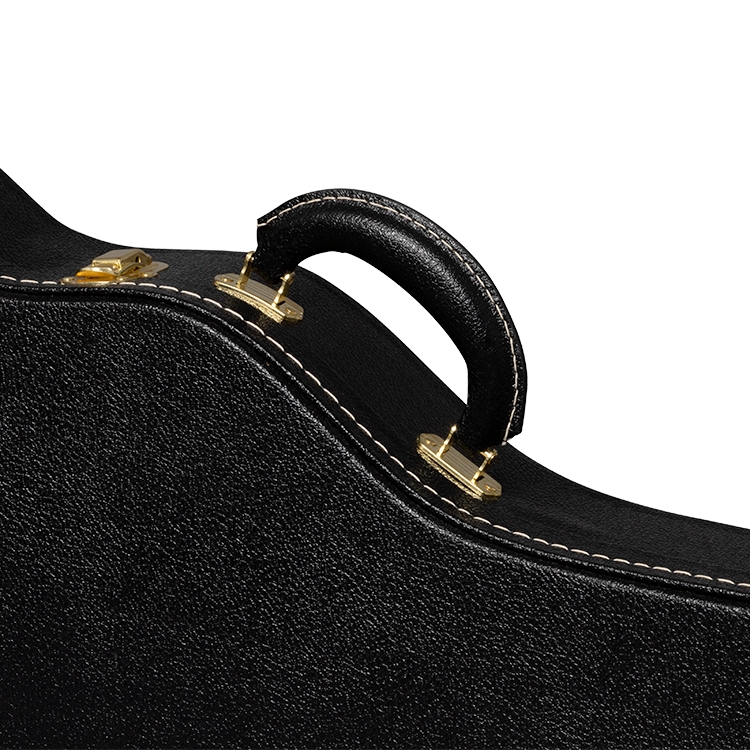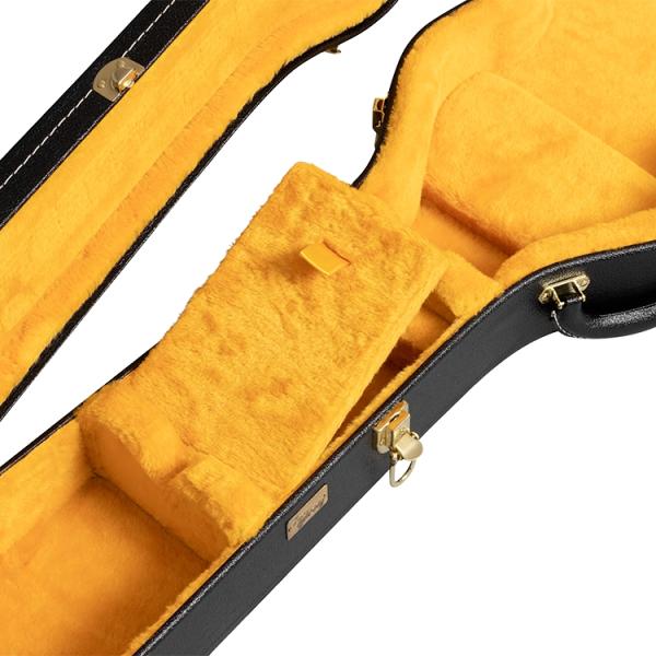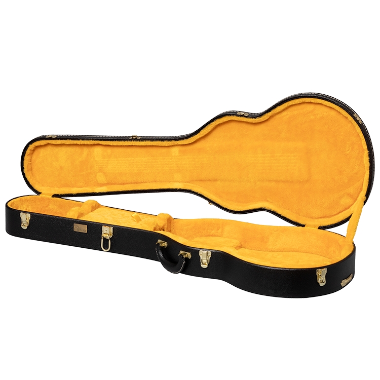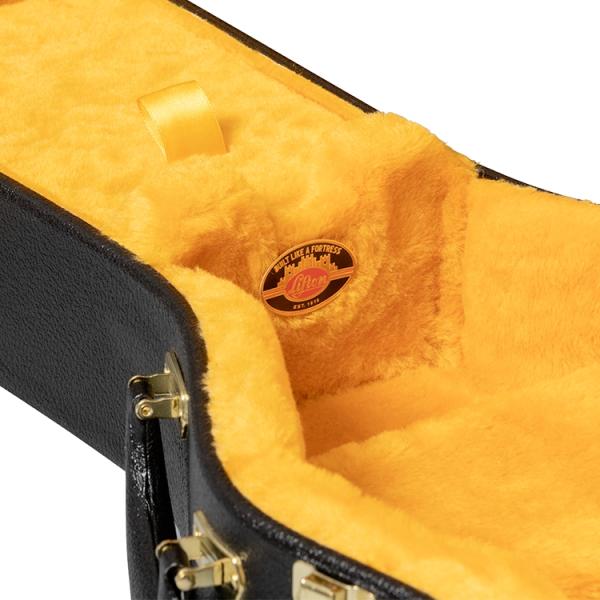 50年代、60年代のギブソンケースにインスパイアされた製品で、定番のブラックの外装にゴールドの内装が映えますね。