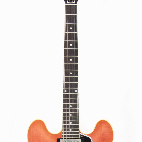 通称ミッキーマウス・イヤーと言われる丸みを帯びたカッタウェイやドットインレイ、ロングピックガードに多くのヴィンテージオリジナルパーツの調査から復刻されたレプリカパーツによりリアルな風格を持つ本機。Murphy Labによるリアルなエイジングが絶妙ですね。当時、少量ながら製作された淡いチェリーカラー"ウォーターメロンレッド"も335ファン大感激の仕上がりでしょう。