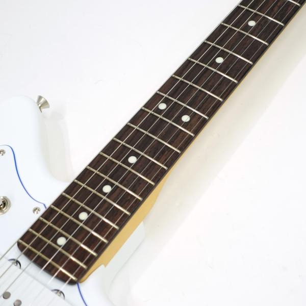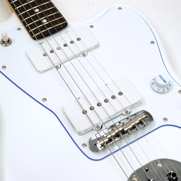 サテン仕様のホワイトなボディに、目を引くブルーのセンターレイヤーを纏った3-Plyホワイトピックガードを搭載しており、ボディとマッチングさせたヘッドに輝くブルーメタルロゴと相まって軽快な雰囲気を醸し出します。 プラスチックパーツも全てホワイトで統一することで、より純白さを際立たせます。