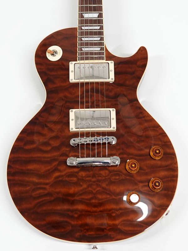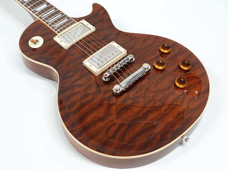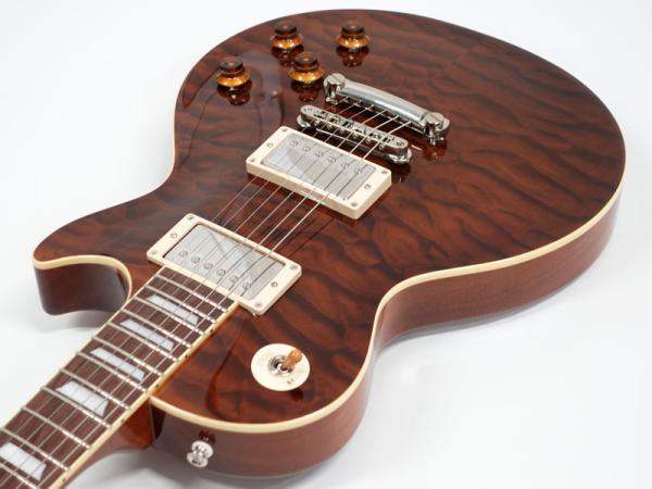 GIBSONレスポールスタンダードを忠実に再現し、トップ材に美しいキルテッドメイプルを採用。美しさと分厚いサウンドは本家GIBSONに負けない完成度です。杢目を活かしたルックスでピックガードを外しています(ピックガードは付属します)