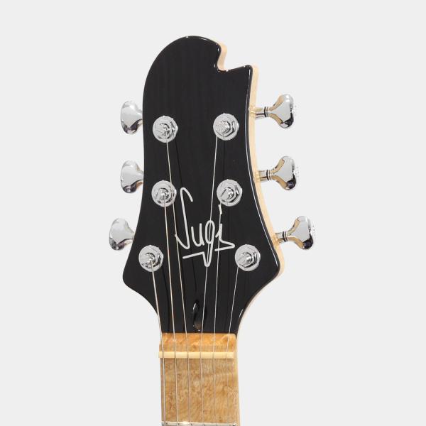 Sugiの専売特許とも言えるエキゾチックウッドをあえて配さずカラフルなカラーリングで仕上げた本機。楽器の輪郭がハッキリする分、ボディシェイプのスタイリッシュさや抱えた時の立ち姿が引き立ちますね。杉本氏のデザインセンスを存分に体感できるのはある意味DS499かもしれません。"実戦でガンガン使うギター"を目指した1本です。