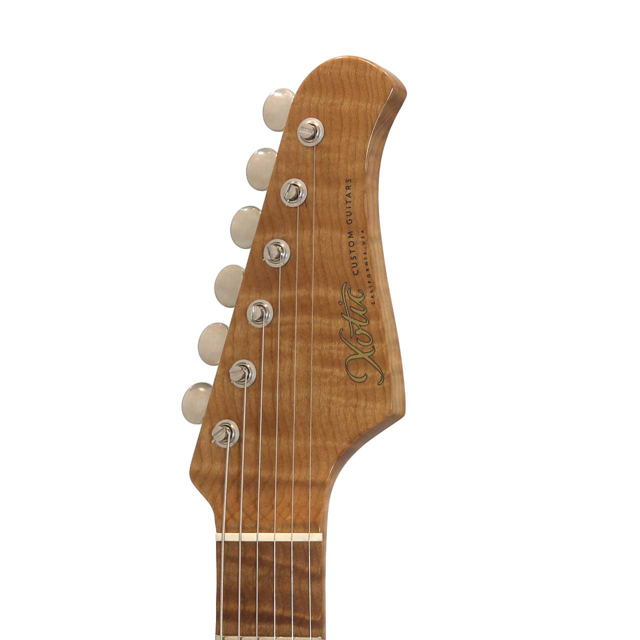 美しいAAAAグレードのフレイムローステッドメイプルネックの塗装は極薄仕上げで高次元なサウンドをアウトプットしてくれます。この素晴らしいネックマテリアルの素性とポテンシャルを存分に引き出すフィニッシュがヴィンテージフィールを持ちながらも現代音楽にマッチするように洗練されたXoticトーンを決定付けていると言っても過言ではありません。ニュアンスに対して余すことなく応えてくれるのでピッキングでトーンコントロールを積極的にしたいギタリストに是非試していただきたいです。