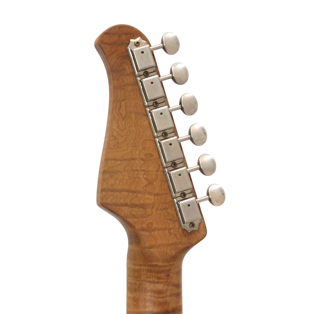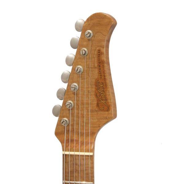 美しいAAAAグレードのフレイムローステッドメイプルネックの塗装は極薄仕上げで高次元なサウンドをアウトプットしてくれます。この素晴らしいネックマテリアルの素性とポテンシャルを存分に引き出すフィニッシュがヴィンテージフィールを持ちながらも現代音楽にマッチするように洗練されたXoticトーンを決定付けていると言っても過言ではありません。ニュアンスに対して余すことなく応えてくれるのでピッキングでトーンコントロールを積極的にしたいギタリストに是非試していただきたいです。