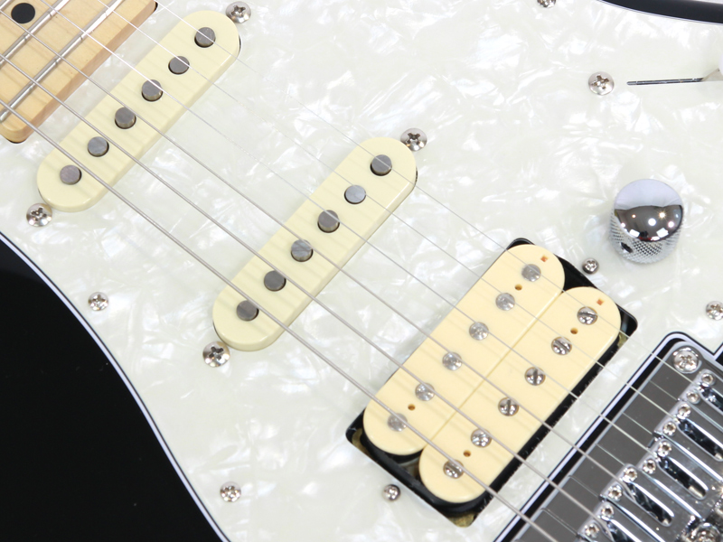 ピックアップはSSH配列。コントロールは、1ボリューム、1トーン、5WAYレバースイッチ。ボリュームとトーンの間にあるミニスイッチはリアPUのコイルタップ機能です。スイッチをONにする(ネック側に倒す)ことでハムバッカーPUの片側のみを鳴らし、擬似的にシングルPUのような歯切れのよいサウンドを得ることができます。