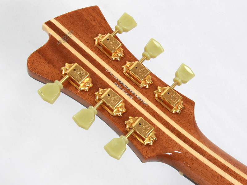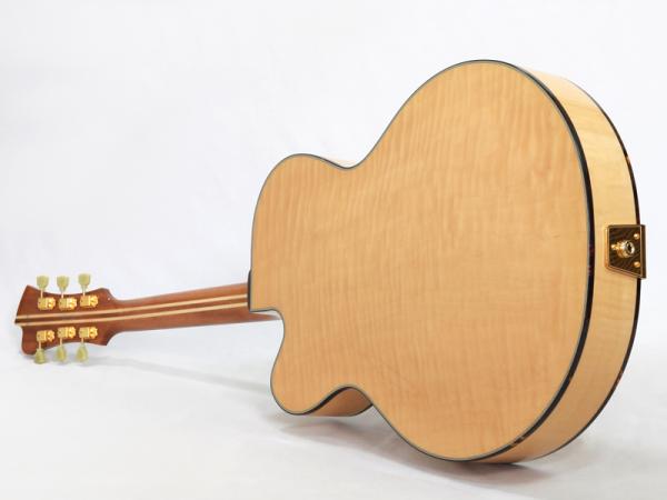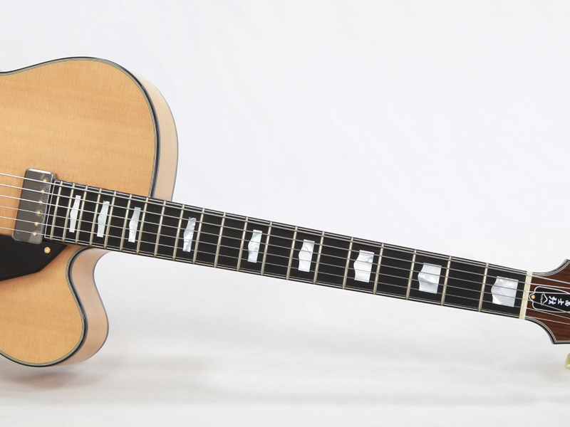 スプルーストップ、カーリーメイプルサイドバックのボディ、エボニー指板と王道スタイル。ミニハムバッカーとコントロール関係はボディの鳴りを最大限にいかすために電装関係はフローティングとピックガード設置とされており、本機が持つ芳醇なサウンドを余すことなくアウトプットしてくれます。