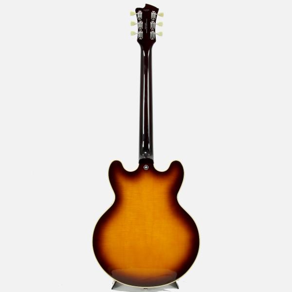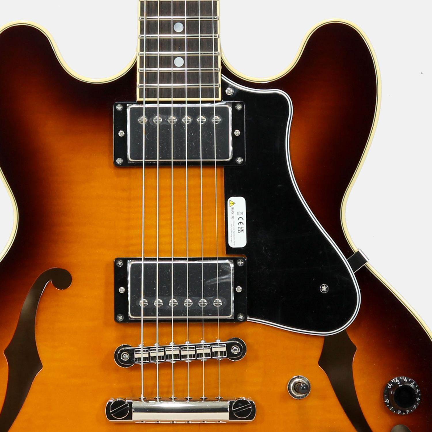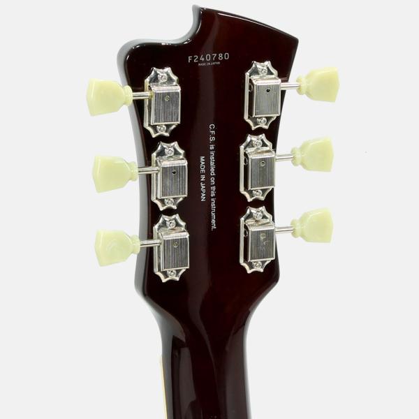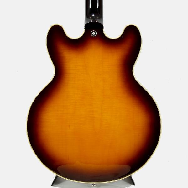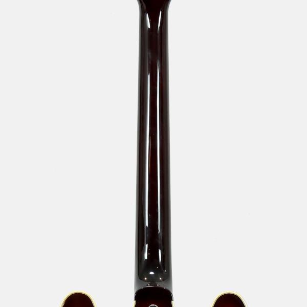ボディサイズはひと回り小さい15インチを採用し、取り回しの良いスタイリッシュな仕上がり。美麗なフレイムメイプルトップ/バックが高級感をもたらしてくれています。絶妙なサイズ感は小柄な方や普段はソリッドモデルをお使いの方にもストレス無くお持ちいただけると思います。また、ソリッドマホガニーをくり抜き加工することで、センターブロックとリム(サイド)が一体型とすることで豊かな鳴りを実現し、それを余すことなくアウトプットしてくれます。ややパワーを抑えたピックアップは繊細なニュアンスを拾い上げてくれる本機にマッチしたオリジナルハムバッカーを搭載。扱いにくい枯れ感は無く、歪みのノリの良いサウンドなので幅広いジャンルで活躍してくれます。