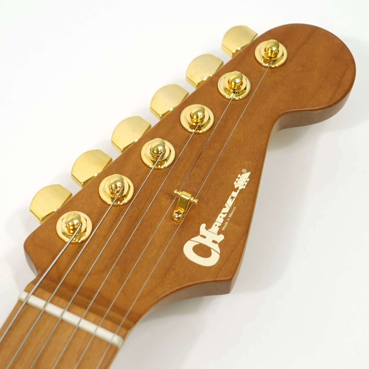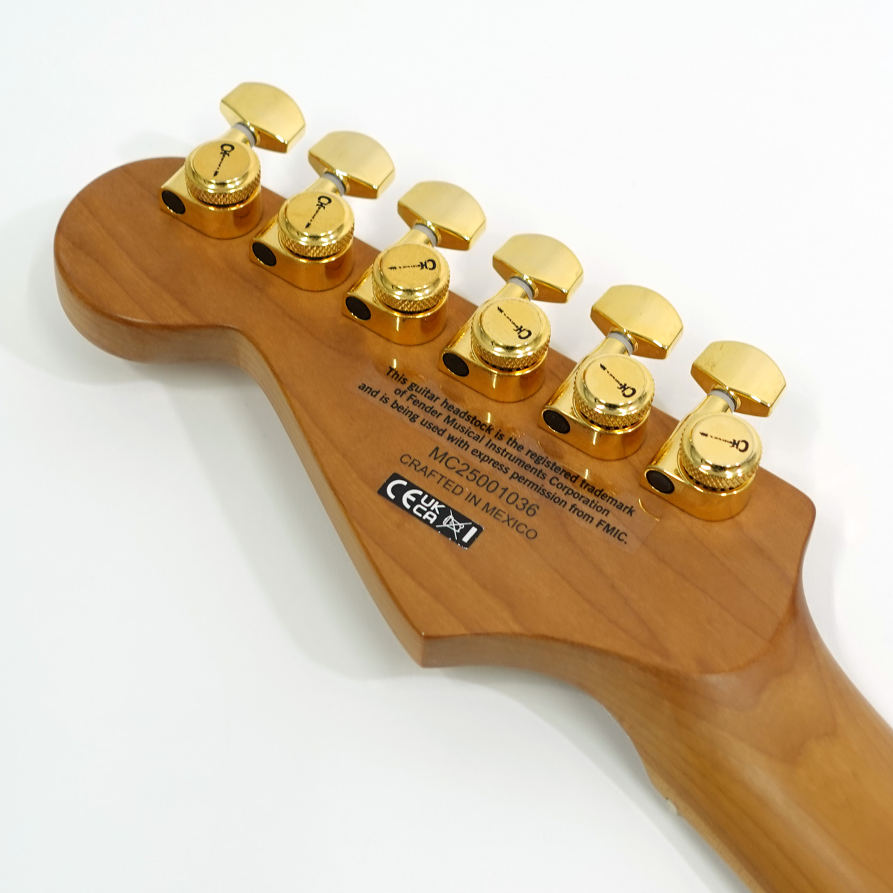 グラファイトで強化され、畜光素材のサイド・ポジションマークが施されたキャラメライズド・メイプル・ネックは、ボディーにストレスのないハイフレットへのアクセスを可能にしたプレートレスのボルト-オン方式でジョイントされています。