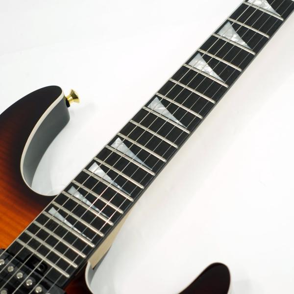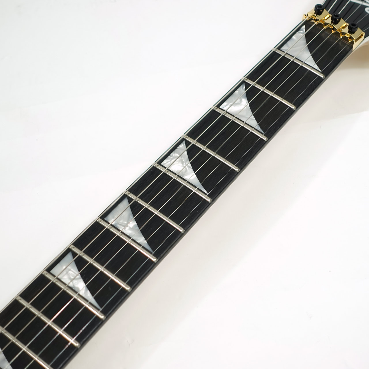 メイプル/ウォールナット/メイプルの5ピースネックは、気候による反りに対する安定性を高めるためにグラファイト補強材を内蔵しボルトオンされており、滑らかな演奏性を実現するために背面にはオイル仕上げが施されています。エッジのロールオフ処理、24ジャンボフレット、パーロイドシャークフィンインレイを備えた12〜16インチコンパウンドラジアス仕様のエボニーフィンガーボードは、ローポジションでのコード弾きからハイポジションでのソロプレイをスムーズにサポート。暗いステージでも視認性を確保したLuminlayサイドドットを採用し、ネックエンド