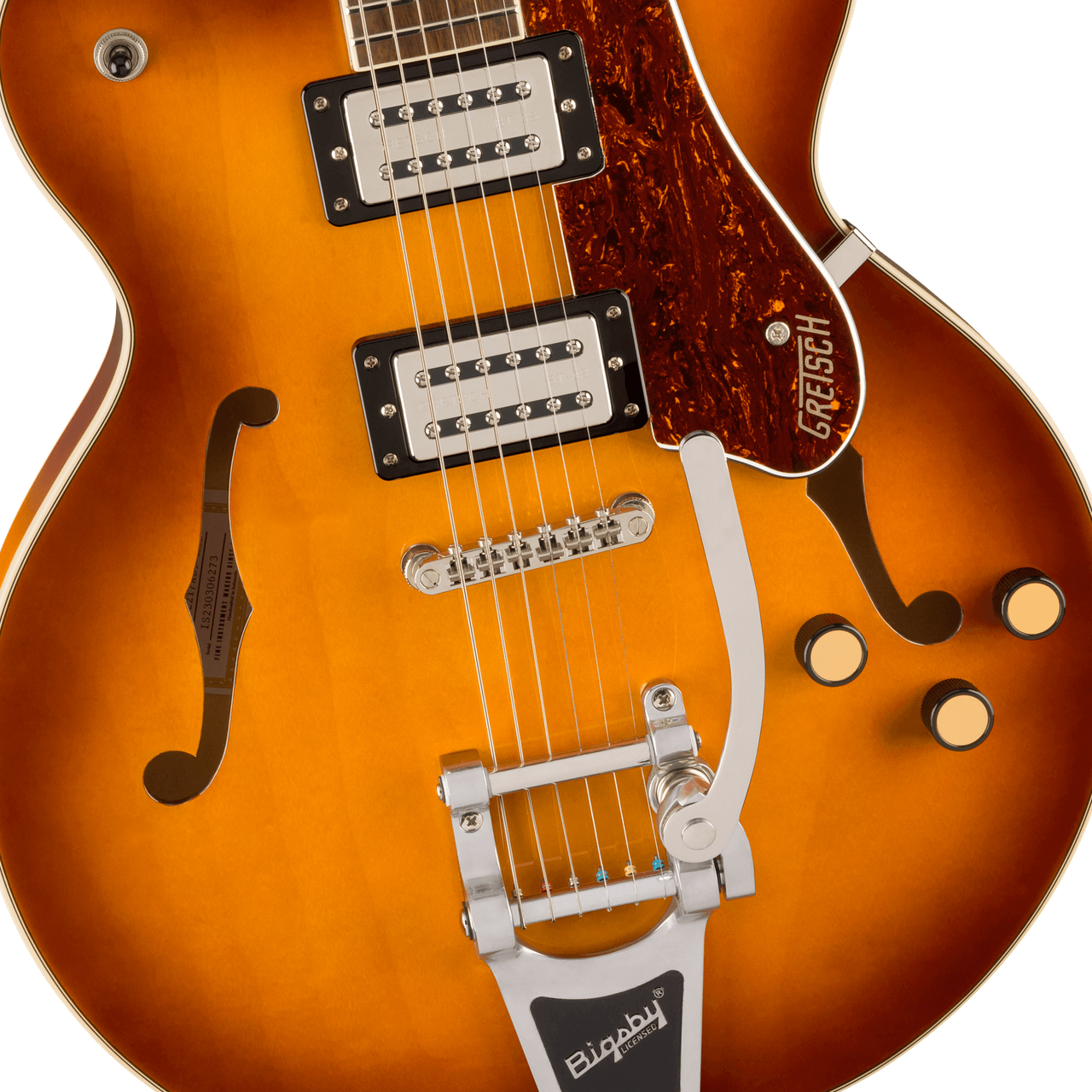 グレッチならではの2ボリューム、マスタートーン、そこにマスターボリュームを追加した仕様です。