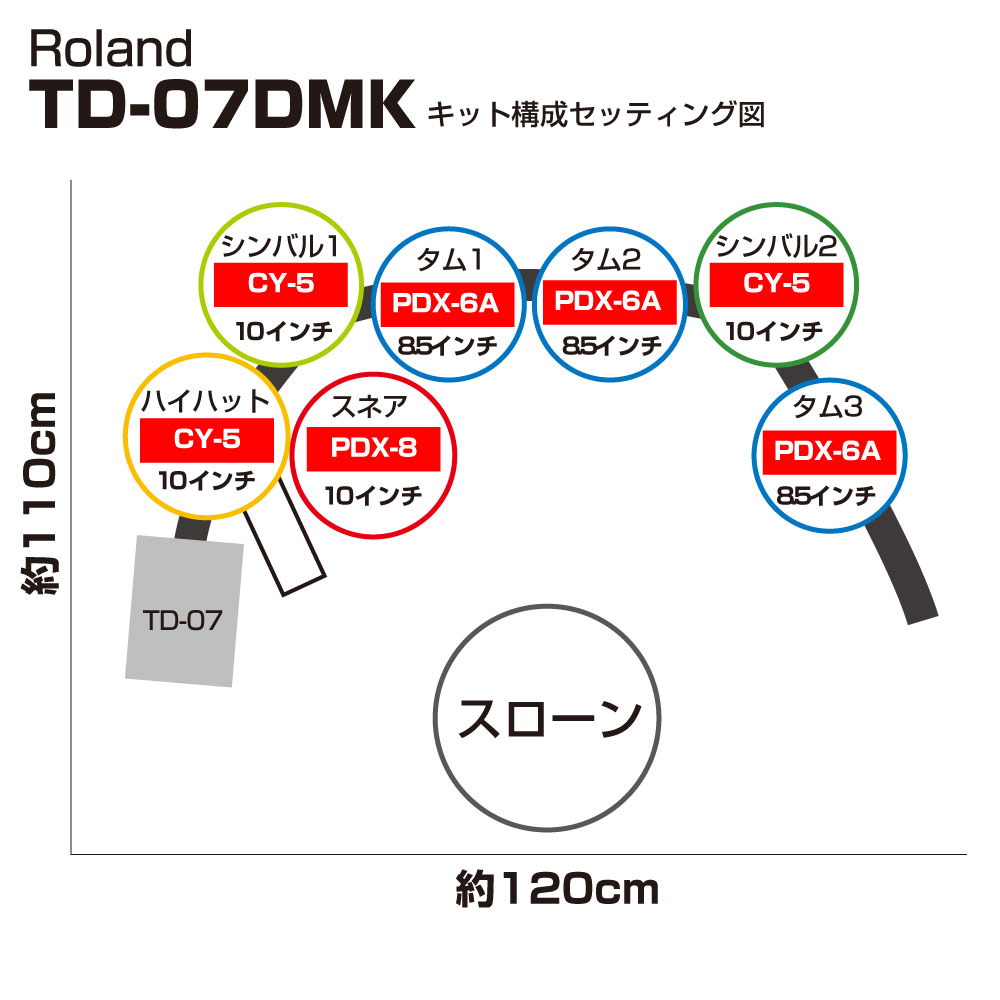 コンパクトなシンバル・パッドCY-5と、スタンド一体型のキック・パッドにより、TD-07シリーズの中で最も省スペースで使用することができます。