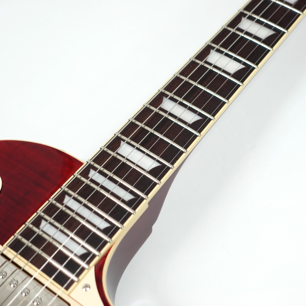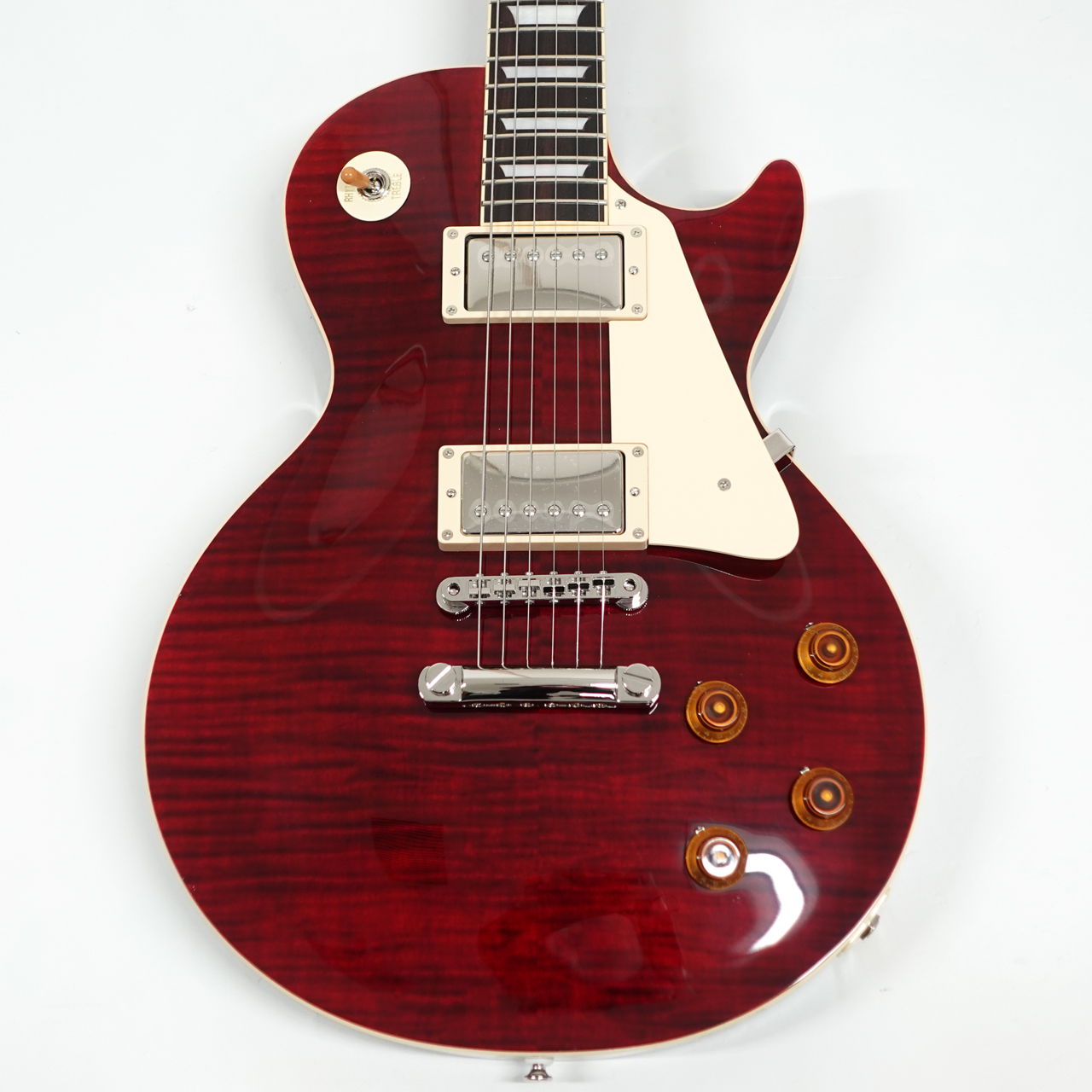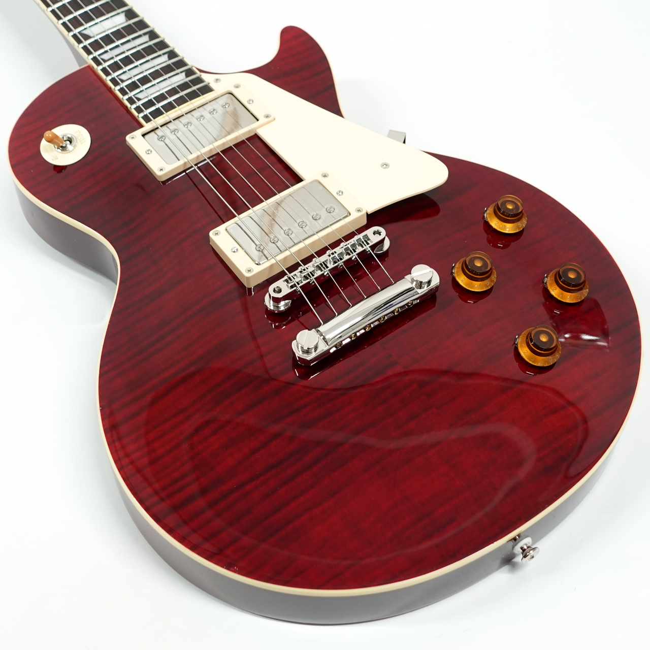 GIBSONレスポールスタンダードを忠実に再現し、見事なフレイムメイプルをトップ材に採用。美しさと分厚いサウンドは本家GIBSONに負けない完成度です。