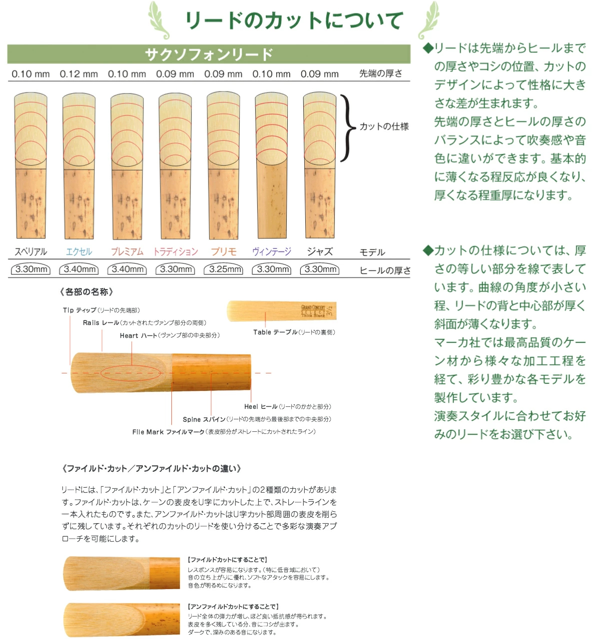 ・アンファイルドカット:リード全体の弾力が増し、ほど良い抵抗感が得られます。表皮を多く残している分、音にコシが出ます。ダークで、深みのある音になります。ジャズ奏者によく使われます。