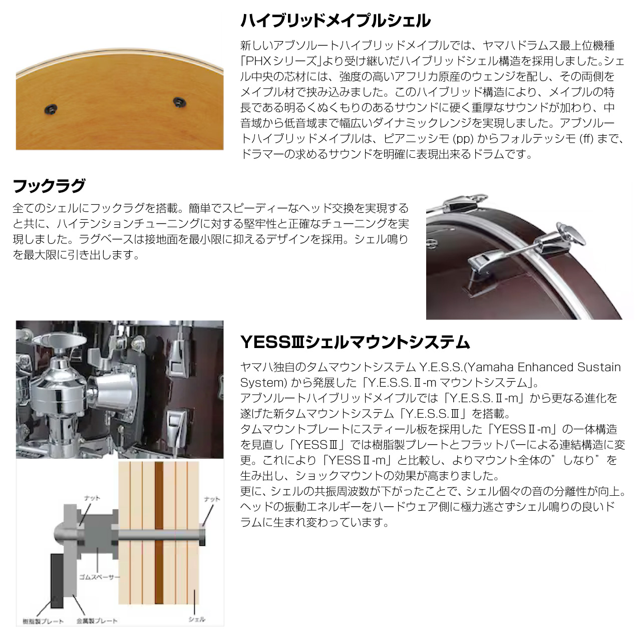 新しいアブソルートハイブリッドメイプルでは、ヤマハドラムス最上位機種「PHXシリーズ」より受け継いだハイブリッドシェル構造を採用しました。