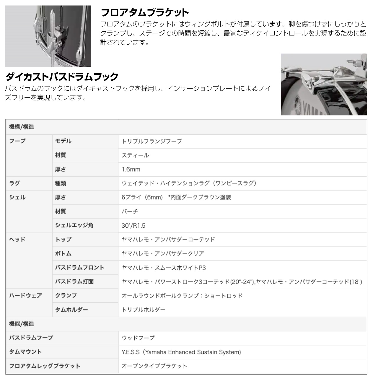 バスドラムには、PS3 Smooth White Yamahaロゴ入りヘッドとRemo PS3 Coatedバッターヘッドを搭載(18インチバスドラムのバッター側にはRemo Ambassador Coatedヘッドを搭載)しています。